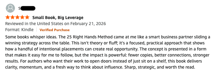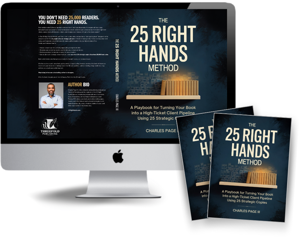 The 25 Right Hands Method is a simple playbook for turning your book into a client generating asset. Instead of trying to sell thousands of copies to strangers, you strategically place your book into the hands of 25 people who can hire you, refer you, or open doors.