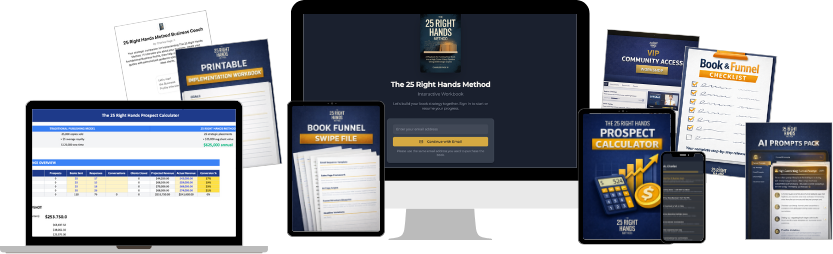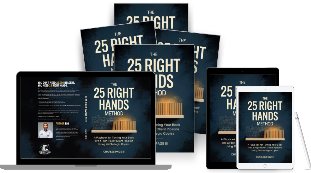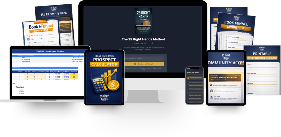 You’re getting the 121-page digital book The 25 Right Hands Method (PDF) that shows you how to turn your book into a high-ticket client pipeline.